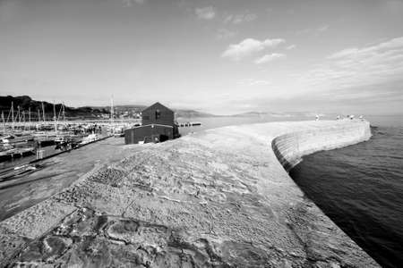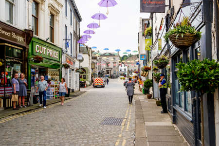 Narrow street of an English city with an old stone wall lit by bright sun. Swanage, United Kingdom