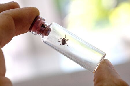 A man holds a test tube in his hands with a poisonous dangerous ixodid tick that bit him by infecting with lime disease. Examination of a tick in a laboratory for infectious diseases.
