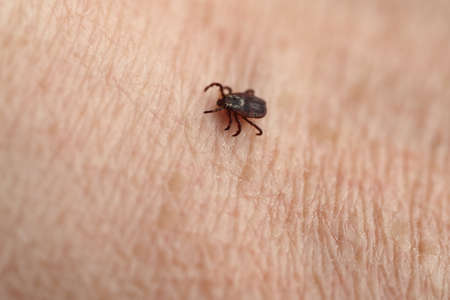 Ixodid, encephalitic live tick on the human body close-up, macro photography. high quality photo
