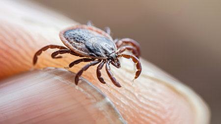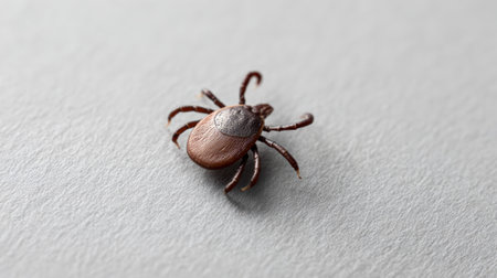 Parasitic tick navigating textured white surface, representing potential transmission of lyme disease, encephalitis, and dangerous tick borne health risks for humans and wildlife