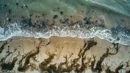 A breathtaking aerial view of waves crashing on a sandy beach, creating a beautiful water and rock landscape art in the world AIG50