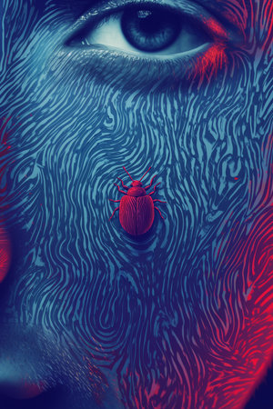 A close-up of a male face featuring stylized patterns resembling fingerprints, with a striking insect positioned prominently, blending art and nature in vivid colors.