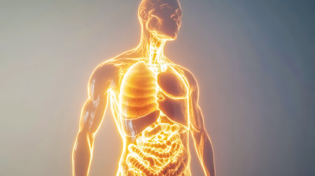 A man's body is shown in a 3D image, with the organs and muscles clearly visible. Concept of awe and wonder at the complexity of the human body, as well as a sense of scientific exploration
