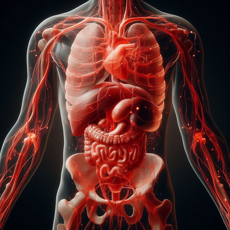 Vessel flow illustrated within a transparent human anatomy model showing detailed circulatory pathways and organ structure for medical education and scientific reference.