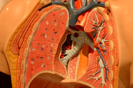 Human model of respiratory system with lungs and blood vessels.