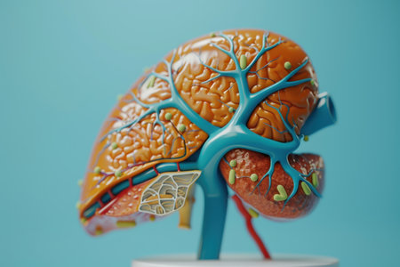 Anatomical model of the human liver with detailed sections illustrating hepatic function and anatomy.
