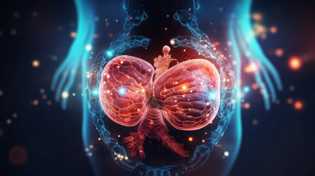 A close up of a pair of kidneys with red and orange blood vessels. The image is a representation of the human body and its internal organs