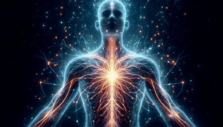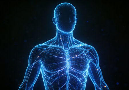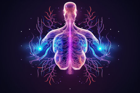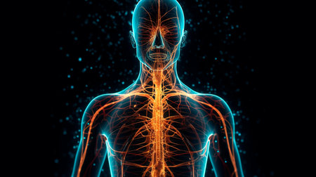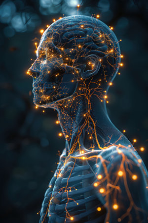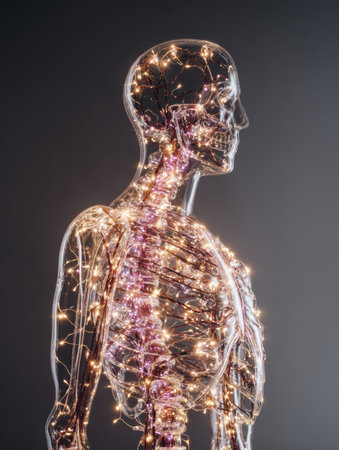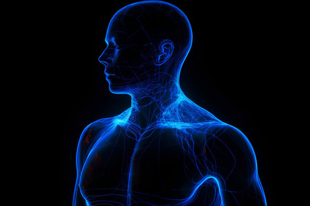 A digital artwork showing a human figure with illuminated nerves and muscles in a dark setting, emphasizing the bodys intricate structures and connections.