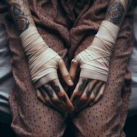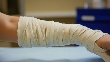 A person is receiving treatment in a medical facility while their arm is carefully wrapped in a bandage. The environment is clinical and focused on healing