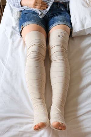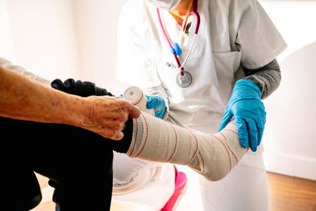 Woman patient with varicose veins applying elastic compression bandage after surgery. Curative treatment, thrombosis prevention and senior health care concept.