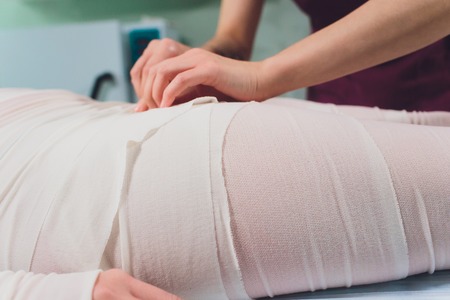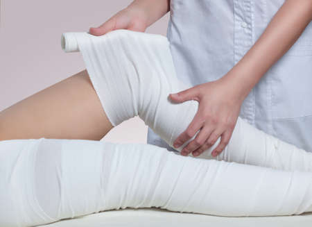 Beautician wearing a white uniform is wrapping the legs of a client lying on a medical couch with white elastic bandages.
