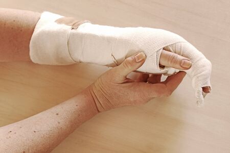 Closeup hand wrapped with bandage on sprain wrist, injury arm treatment. Concept, health problem, accident, first aid. Insurance.