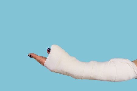 Close up of a woman white long arm plaster, broken hand on blue background.