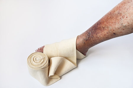 leg of an elderly woman with varicose veins and its complications on white background. Elastic bandage and compression treatment. Medical history. Sclerosing. Thrombophlebitis