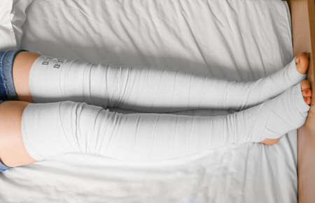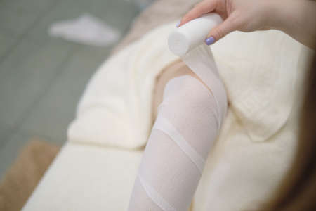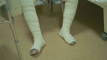 Woman with broken leg. female bandaging foot on the floor. The concept of a sore person with a limb injury. close-up.