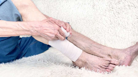 Middle-aged Caucasian man produces an independent bandage of his dislocated leg. He puts an elastic bandage over his swollen shin. First aid in sprains and dislocations. Bandage stabilizes ankle joint.