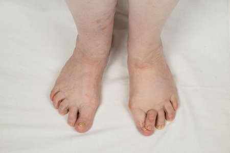 Legs of an elderly woman with rheumatoid arthritis. Deformed rheumatoid foot