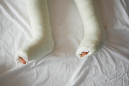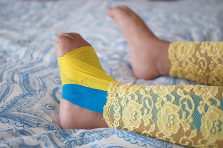 An injured foot wrapped in a bandage is gently resting on the floor, awaiting care and healing