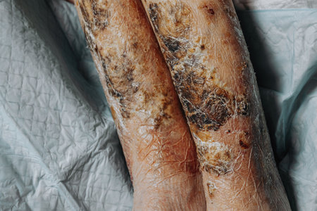 Skin lesions on the leg. Symptoms characteristic of the elderly begin with a red rash in a small circle and spread to a wider area. Large scabs on the legs. Elderly care. Consequences of diabetes