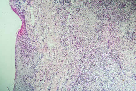 Ovarian cancer, light micrograph, photo under microscope. Photograph shows a fragment of a cancerous tumor in the female ovary. Selective focus