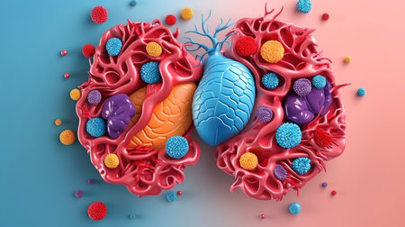 This vibrant 3D rendering showcases a human kidney with intricate vascular structures, ideal for educational and medical use. The creative design highlights the organ's anatomy and surrounding features in a visually appealing format.