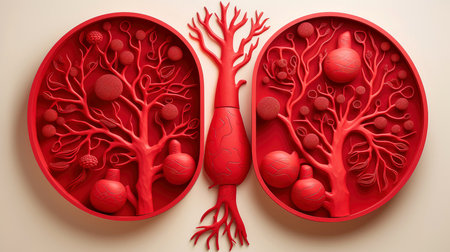 A close up of a pair of kidneys with red and orange blood vessels. The image is a representation of the human body and its internal organs