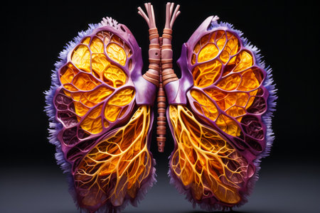 Cross-section of a human lung, showing the bronchi, alveoli, and other respiratory structures in a 3D anatomical model