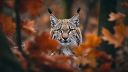 A focused lynx gazes intently, beautifully framed by vibrant autumn leaves in the forest. AI generated image