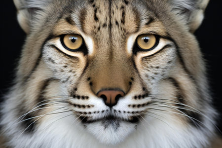Close-up portrait of a lynx with bright eyes on a dark background. Space for text