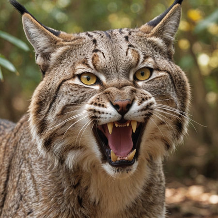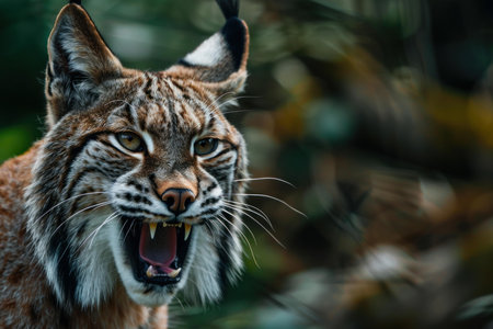 Closeup of a powerful lynx midroar, showcasing its ferocity and sharp teeth against a blurred forest background