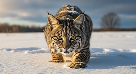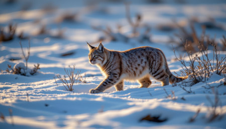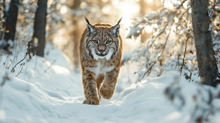 Graceful Lynx Walking Through Snowy Landscape in Golden Light, Capturing the Beauty of Nature and Wildlife in Winter Environment