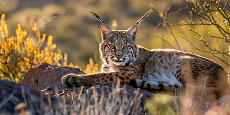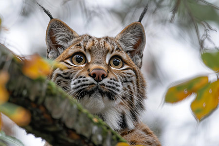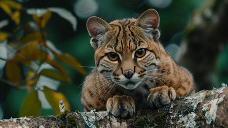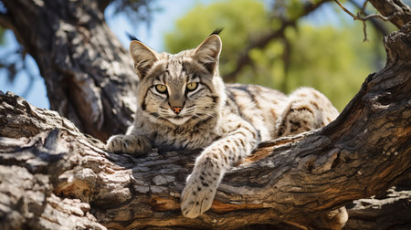 Beautiful bobcat perched on tree branch in wild, wildlife photography