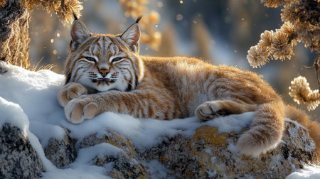 Lynx resting on snowy rock in winter sunlight