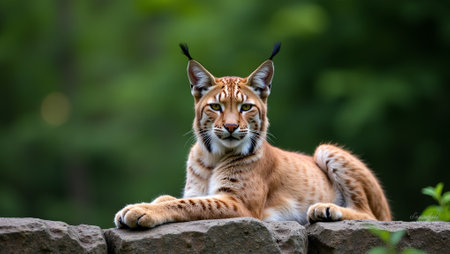 Majestic lynx resting on rocky ledge tufted ears raised thick spotted fur lush green forest backdrop