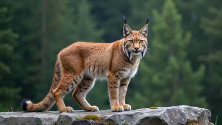 Majestic lynx perched on rocky ledge eyes focused on dense forest below