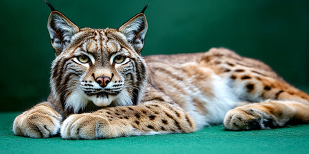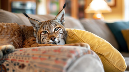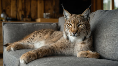 A stunning lynx lounges gracefully on a stylish couch, highlighting its beautiful fur and captivating eyes, perfect for nature enthusiasts.