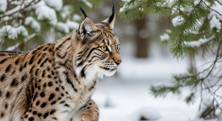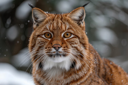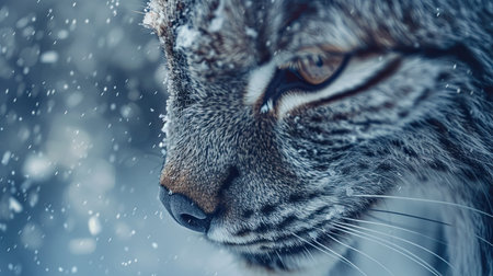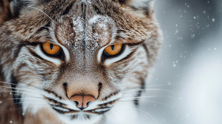 Close-up of a lynx with captivating amber eyes, amidst gentle snowfall, highlighting the animal's fur texture and the peaceful winter atmosphere of its natural habitat