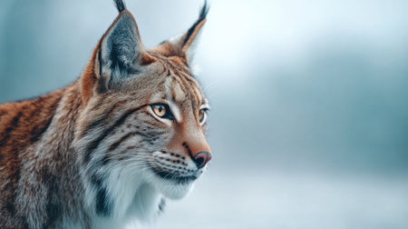 This captivating portrait showcases a lynx with its beautiful features and striking eyes, set against a misty background that enhances its wild elegance.