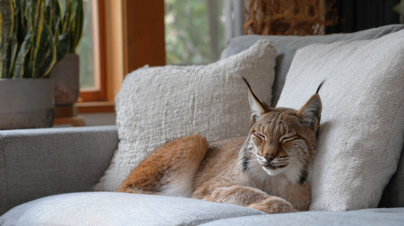 A peaceful lynx naps comfortably on a couch filled with soft pillows, creating a cozy scene enhanced by indoor plants and natural light.