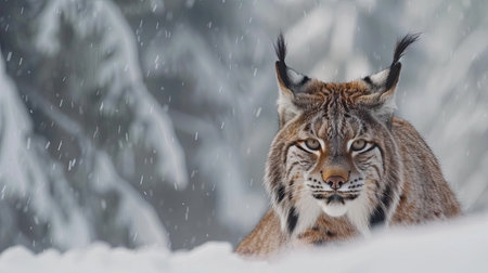 Majestic lynx stands amidst snowflakes, highlighting its beautiful fur and intense gaze, embodying the essence of wildlife in a tranquil winter setting