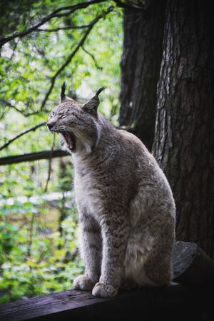 Yawning lynx sitting on a wooden beam near Bad Schandau, Saxony, Germany