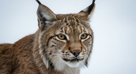 Capture the striking beauty of a lynx in this close-up portrait. The wildcat's intense gaze and detailed fur texture shine against a soft, snowy background.