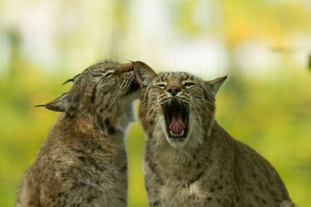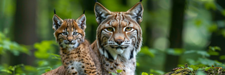 Male lynx with cute cub, empty space for text on the left side, object placed on the right