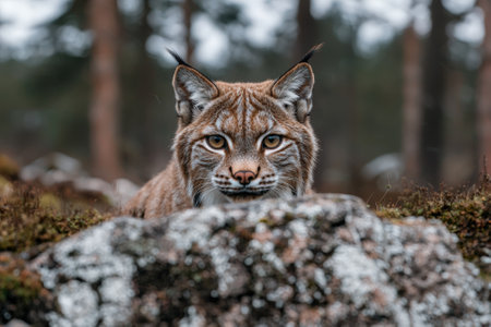 A majestic lynx peers over a rocky outcrop in its natural habitat.