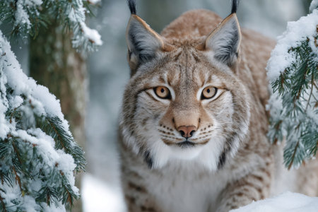 Eurasian lynx staring through snowy pine branches in winter forest