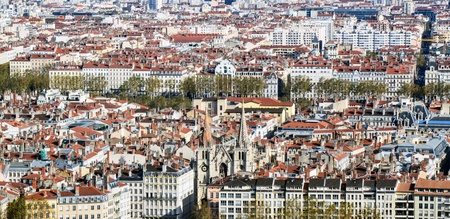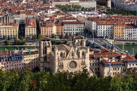 Aerial view of Lyon with the cathedral. Lyon, Rhone-Alpes, France.