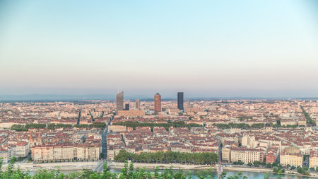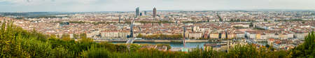Lyon panorama elevated view on sunny day. Aerial panoramic view of Lyon with the skyline of Lyon skyscrapers visible in background.