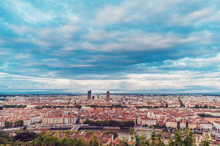 Panorama of the city Lyon in France taken from the hill of Notre-Dame-De-Fourvières