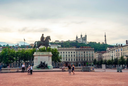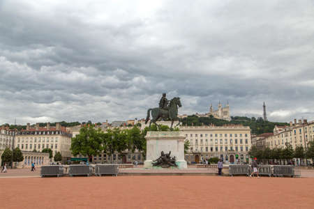 LYON, FRANCE - June 11, 2018 : View Bellecour square with a bronze equestrian statue of Louis XIV in the center, 1825. Lyon Place Bellecour statue of King Louis