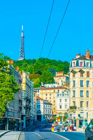LYON, FRANCE, JULY 22, 2017: People are strolling under metallic tower through a narrow street in the historical center of Lyon, France